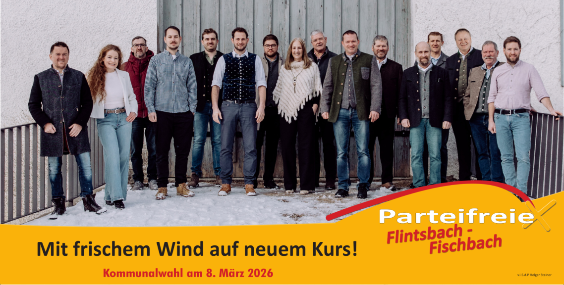 Mit Bürgermeisterkandidat Holger Steiner sowie 15 weiteren Gemeinderatskandidaten und -kandidatinnen möchten wir Verantwortung für unseren Ort übernehmen sowie mit frischem Wind einen neuen Kurs in der Flintsbacher Kommunalpolitik einschlagen. Unser Ziel ist es, die kommunalpolitischen Erfahrungen der vergangenen Jahre sowie die innovativen Impulse, die unser starkes Kandidatenteam mitbringt, zu nutzen und zugleich gemeinsam mit den Bürgern neue Wege einzuschlagen – für ein liebenswertes sowie lebendiges Flintsbach und Fischbach.